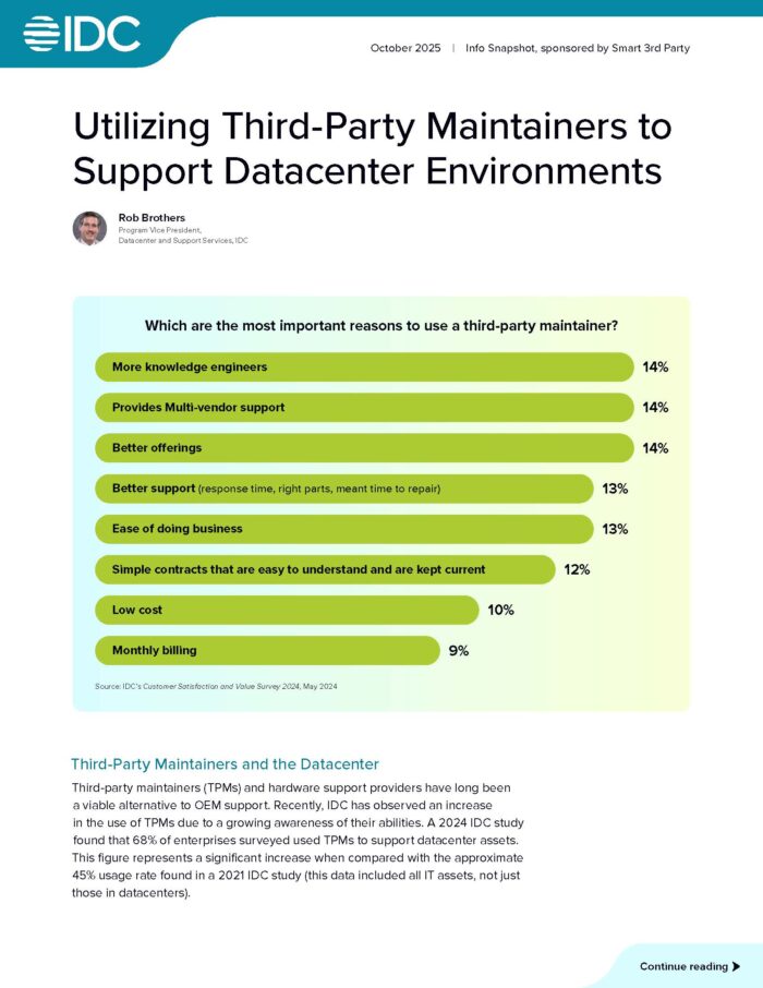 DC’s latest Info Snapshot — “Utilizing Third-Party Maintainers to Support Datacenter Environments” — reveals why 68% of enterprises now rely on TPM providers to extend the life of their datacenter hardware, cut costs, and improve uptime.